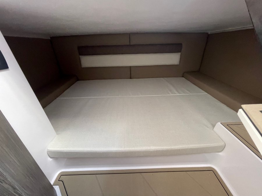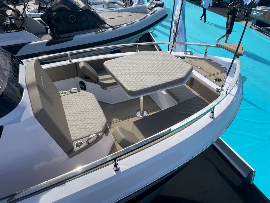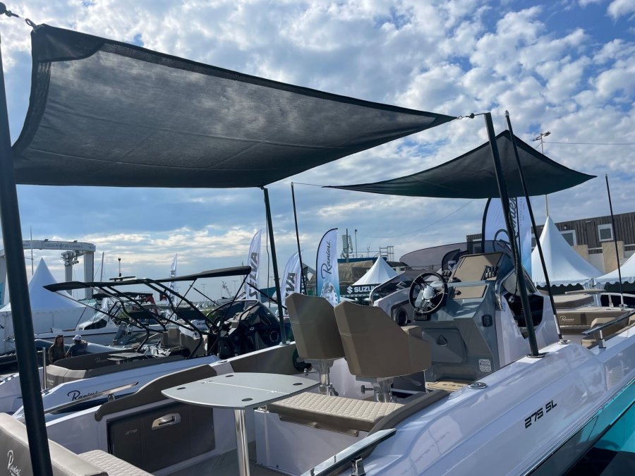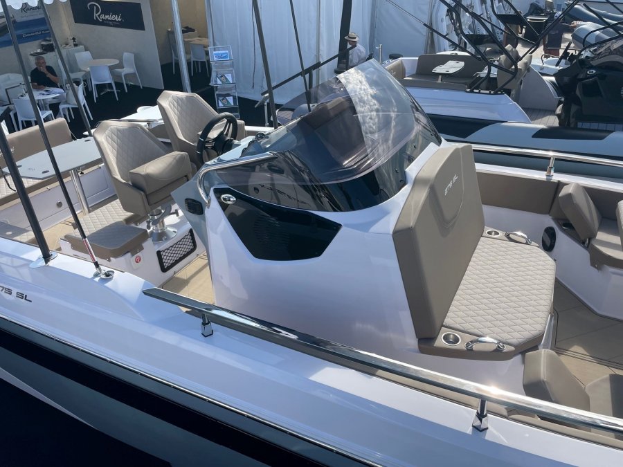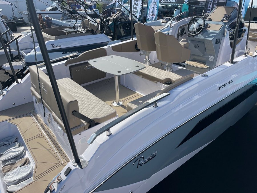 Nouveauté 2024 du chantier RANIERI, le 275 SL est un open propant un carré avant modulable, une cabine acceuillant un réfrigérateur, un WC et un petit couchage en mid cabin.