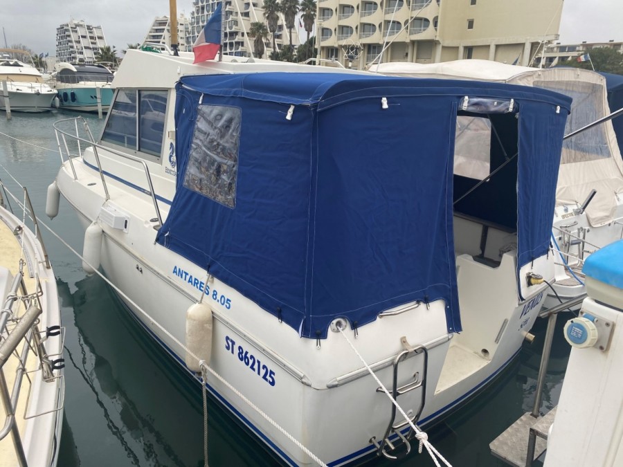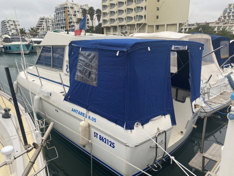 Vedette pêche promenade, Bénéteau Antarès 805 à vendre avec place à l'année, en très bon état général, motorisé en Volvo Penta TAMD 41 P ( 200 cv ), peu d'heures ( 560h), taud de camping neuf, guindeau électrique, propulseur d'étrave, GPS traceur Garmin, révision moteur faite en 2021, pas de travaux à faire.