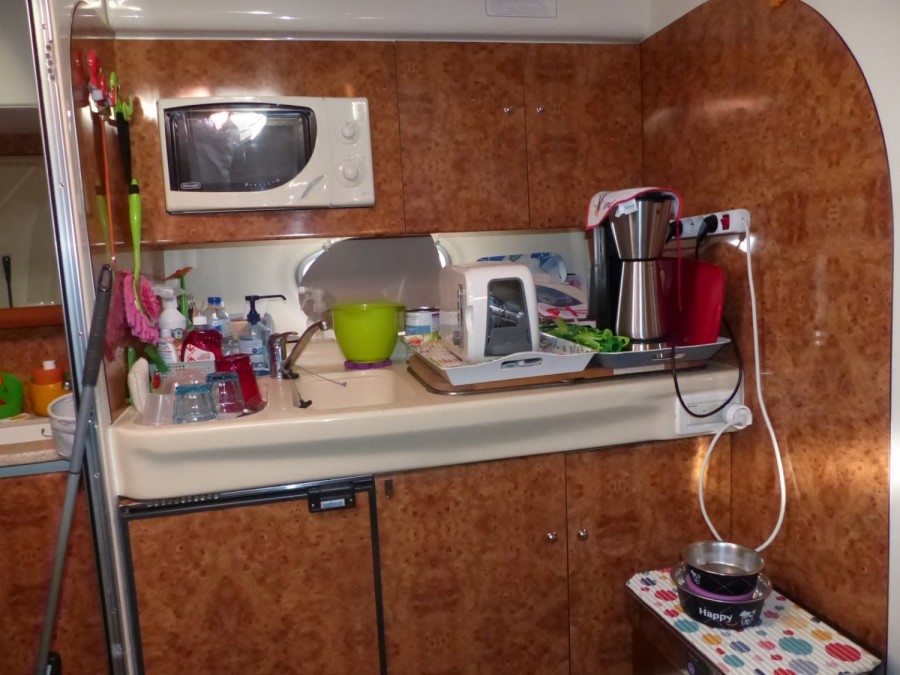 cuisine équipée: plaque 2 feux électrique, four micro-ondes, évier, placards de rangement, frigo 12 v