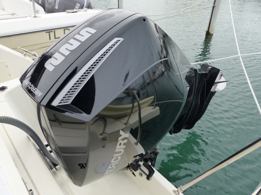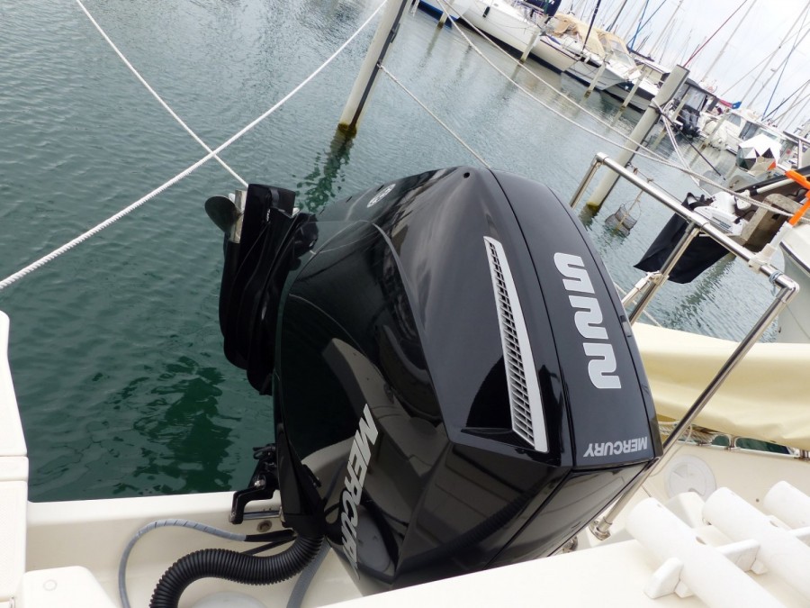 Moteur Mercury 225 cv, seulement 83 heures, dans un état neuf avec housse de protection.
