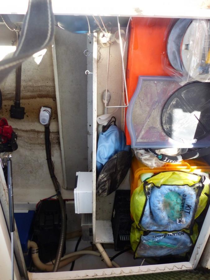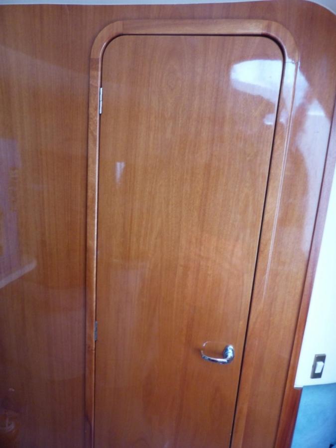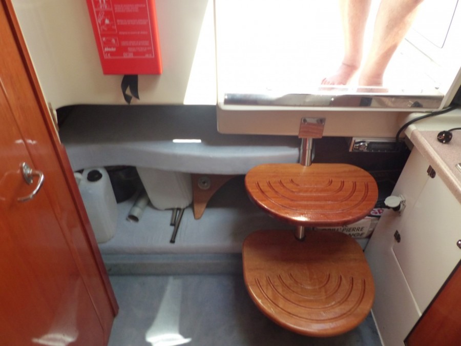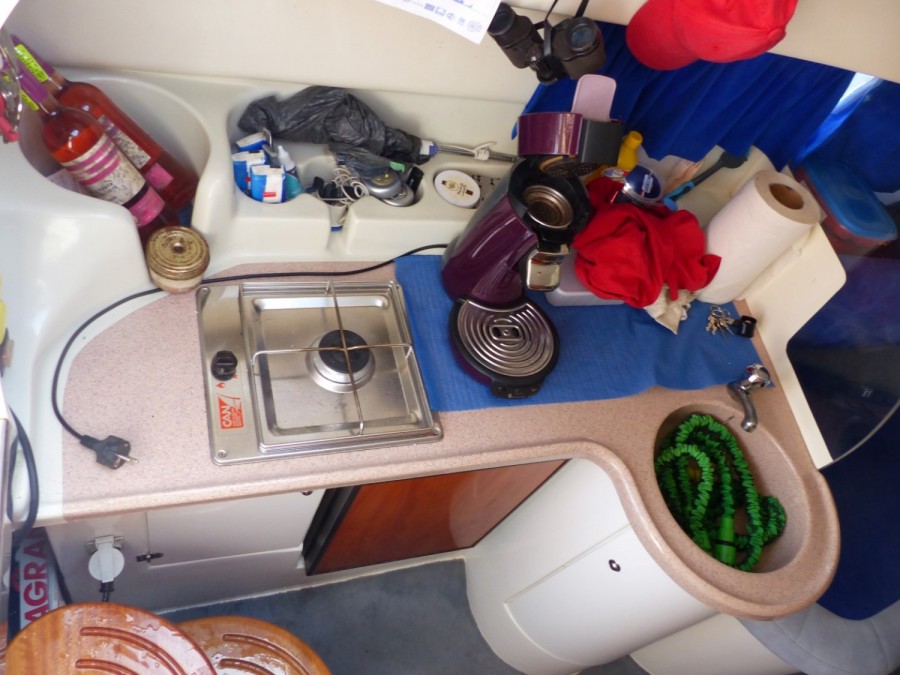 Une couchette double, une salle d'eau, un carré arrondi avec table, très beau beau cockpit avec banquette, plage arrière avec échelle de bain.